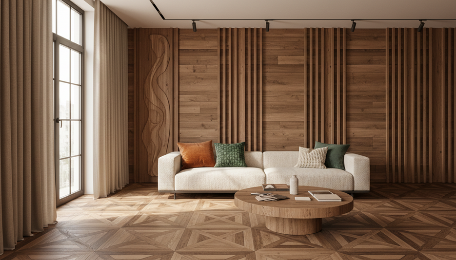 Тенденция к натуральным материалам сохраняется. По наблюдениям отрасли, «дерево во всей своей красоте» не покидало рынок: если в предыдущие сезоны доминировала облицовка панелями, то в 2026 году допустимы разные форматы — паркет, декоративная облицовка, полное «погружение» в материал (material drenching). Аналитика отмечает также рост внимания к восстановлению и шлифовке деревянных поверхностей в домах.