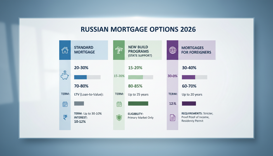 По состоянию на 23 января 2026 российские банки предлагают несколько основных типов ипотечных программ: стандартная ипотека под залог приобретаемой квартиры, программы для новостроек с господдержкой и специальные предложения для покупателей на вторичном рынке. Эксперты отмечают, что, несмотря на высокий уровень процентных ставок, ипотека остаётся ключевым инструментом финансирования жилья.