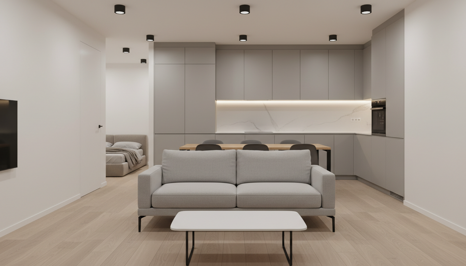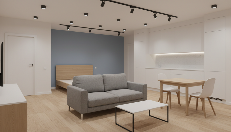 Минималистичный интерьер 1-комнатной квартиры 24.26 м² для пары. Средний бюджет, ЖК НИКС ЛАЙН на Блюхера, функциональность и уют.