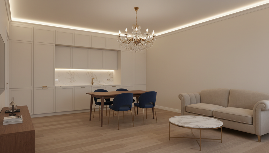 Дизайн 2-комнатной квартиры 37.8 м² в ЖК «Морская миля» в стиле современной классики для семьи с ребёнком. Средний бюджет, комфорт...