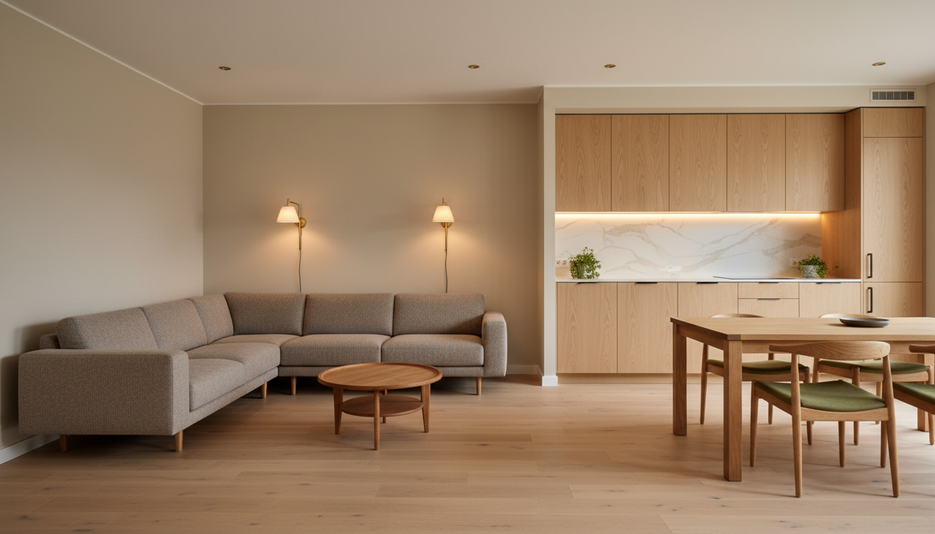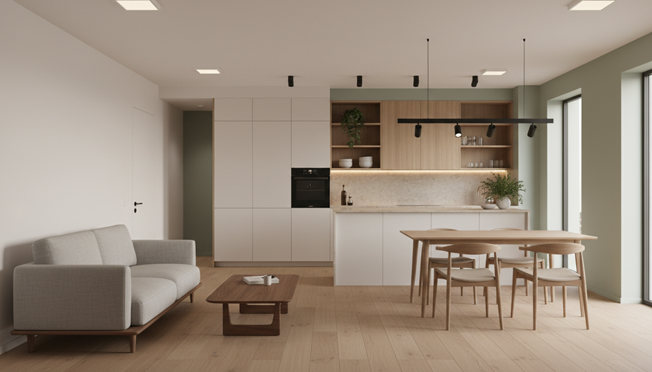 Интерьер 1-комнатной квартиры в ЖК Аквамарин, 31.98 м², стиль Japandi, средний бюджет. Практично, уютно, с натуральными материалами и спокойными цветами.