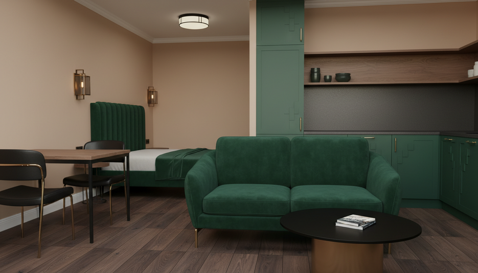 Бюджетный дизайн 1-комнатной квартиры 40 м² в ЖК «Ласточкино» в стиле Арт-деко с удобной функциональностью для аренды.